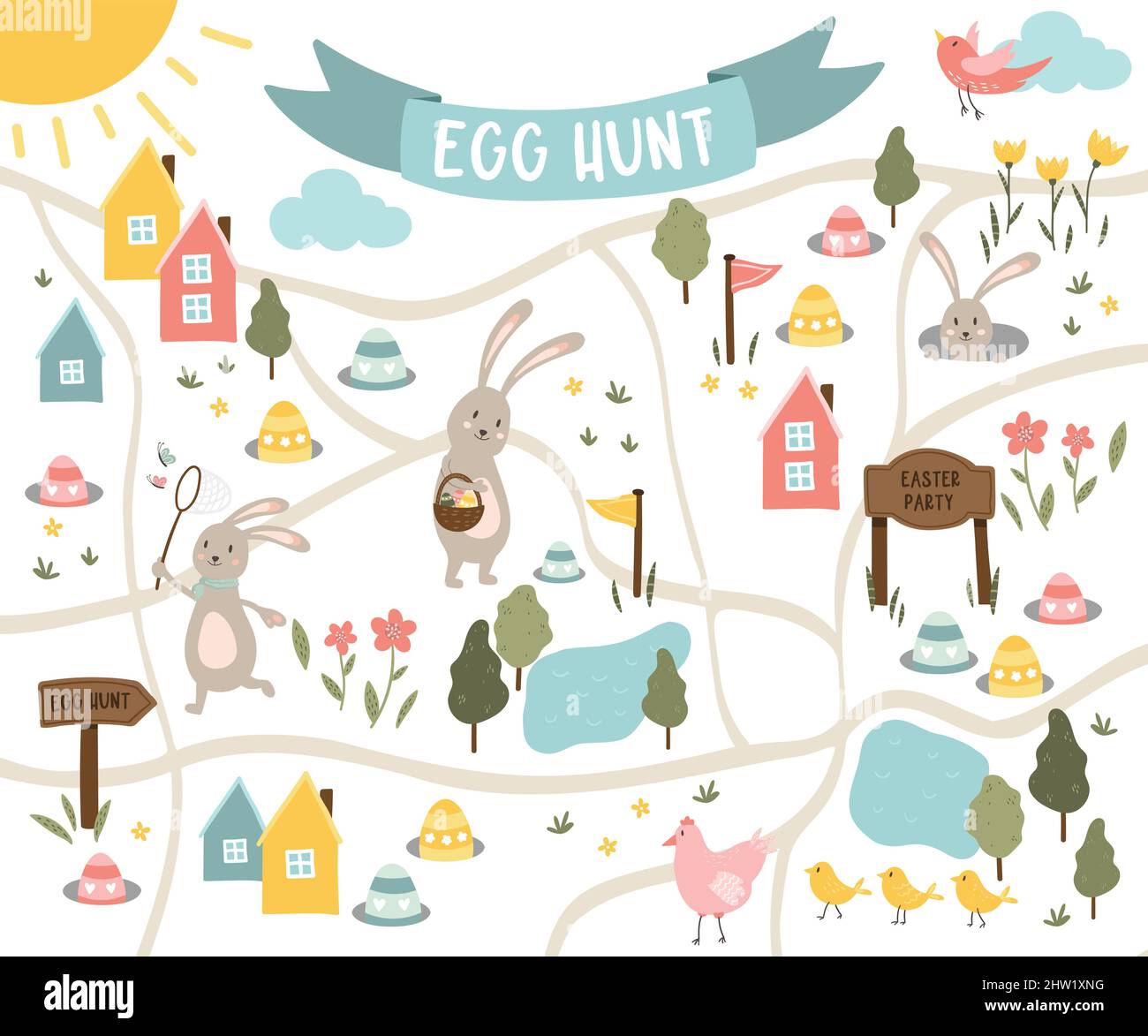 Cute Easter Egg hunt design, map for children, hand drawn with