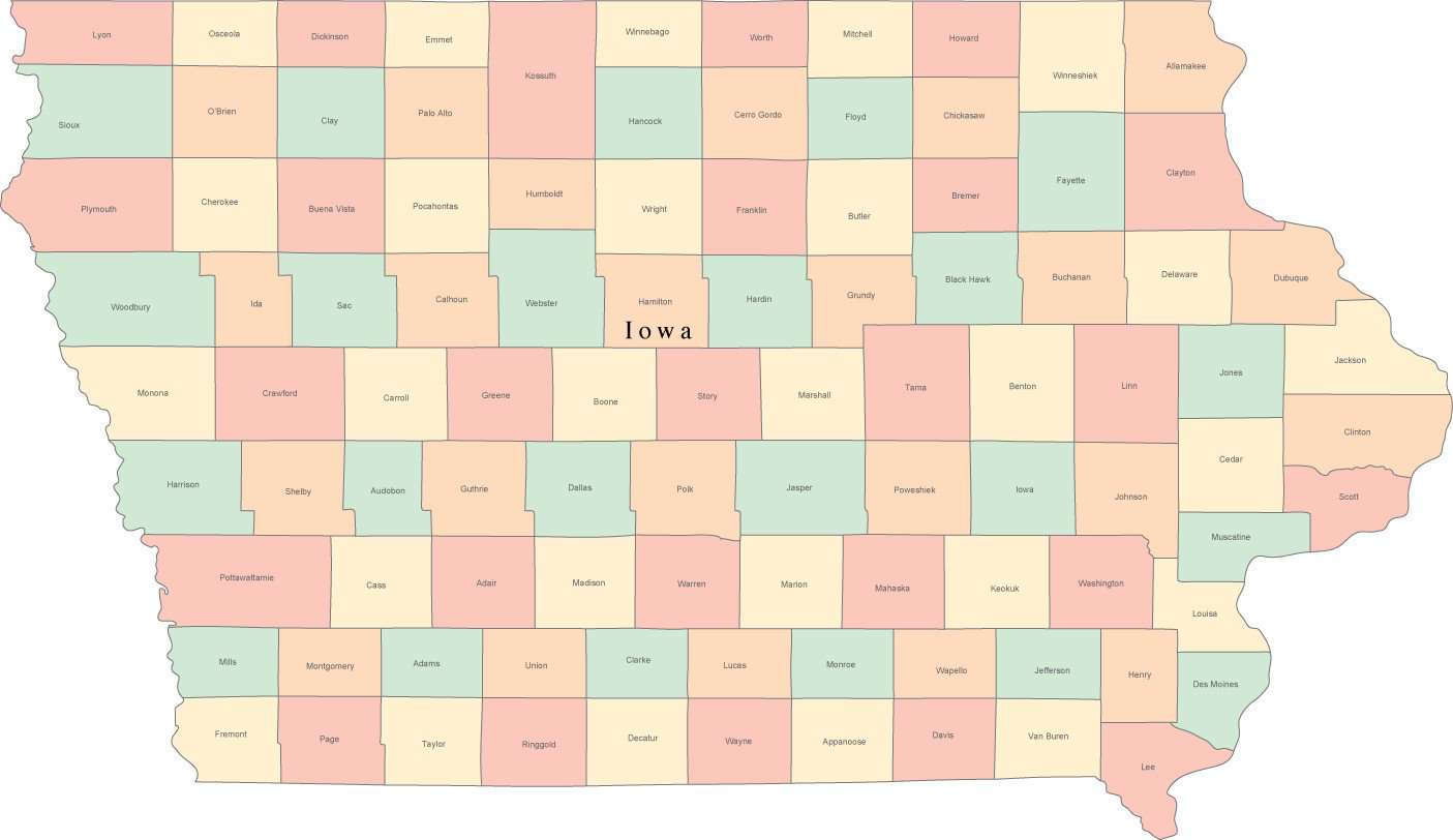 Multi Color Iowa Map with Counties and County Names